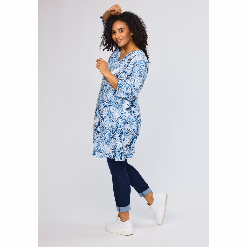 birgitte blå klänning /tunika från studio I lager. 899 kr storlek 36 38/40 42/44 46/48 54/56 Lägg i korgen Antal: v-ringad, generös passform, fickorvit/blått printlängd 95% i stl 36100% vävd viskos