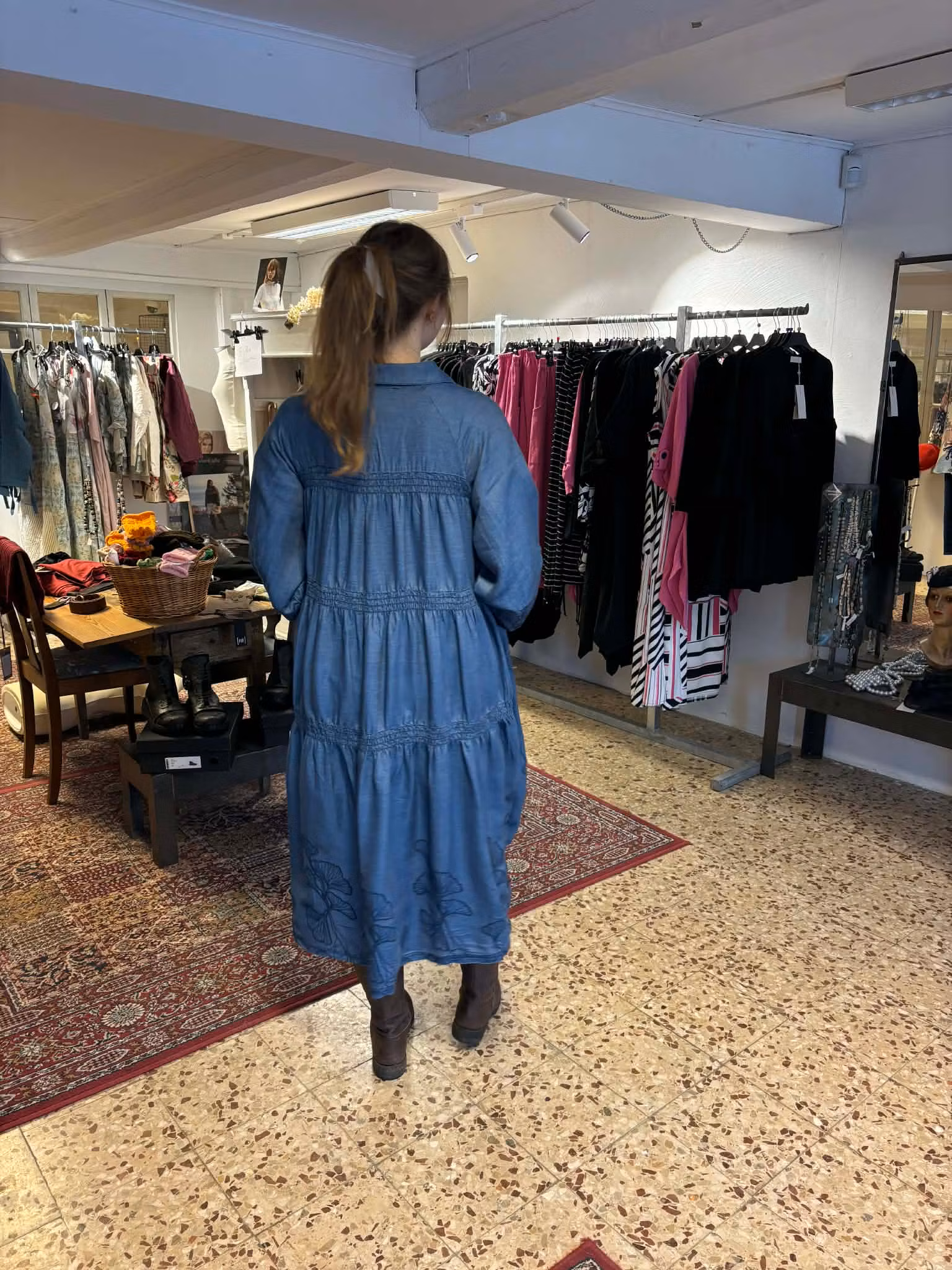 jeansklänning från noen I lager. 1 799 kr storlek 36 38 40 42 44 46 34 Lägg i korgen Antal: generös modell, ursnygg och fickor i sidorna. klänning men kan användas som öppen kaftankul detaljer i ryggen. mönster på ärmslut och i sidan 100% lyocell (viskos) Tuva har stl 36 bystvidd 108 cm, längd 114 cm