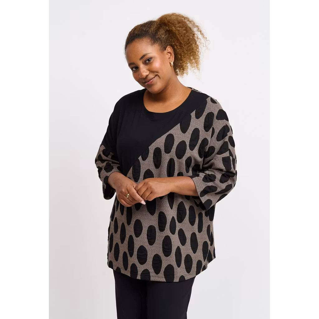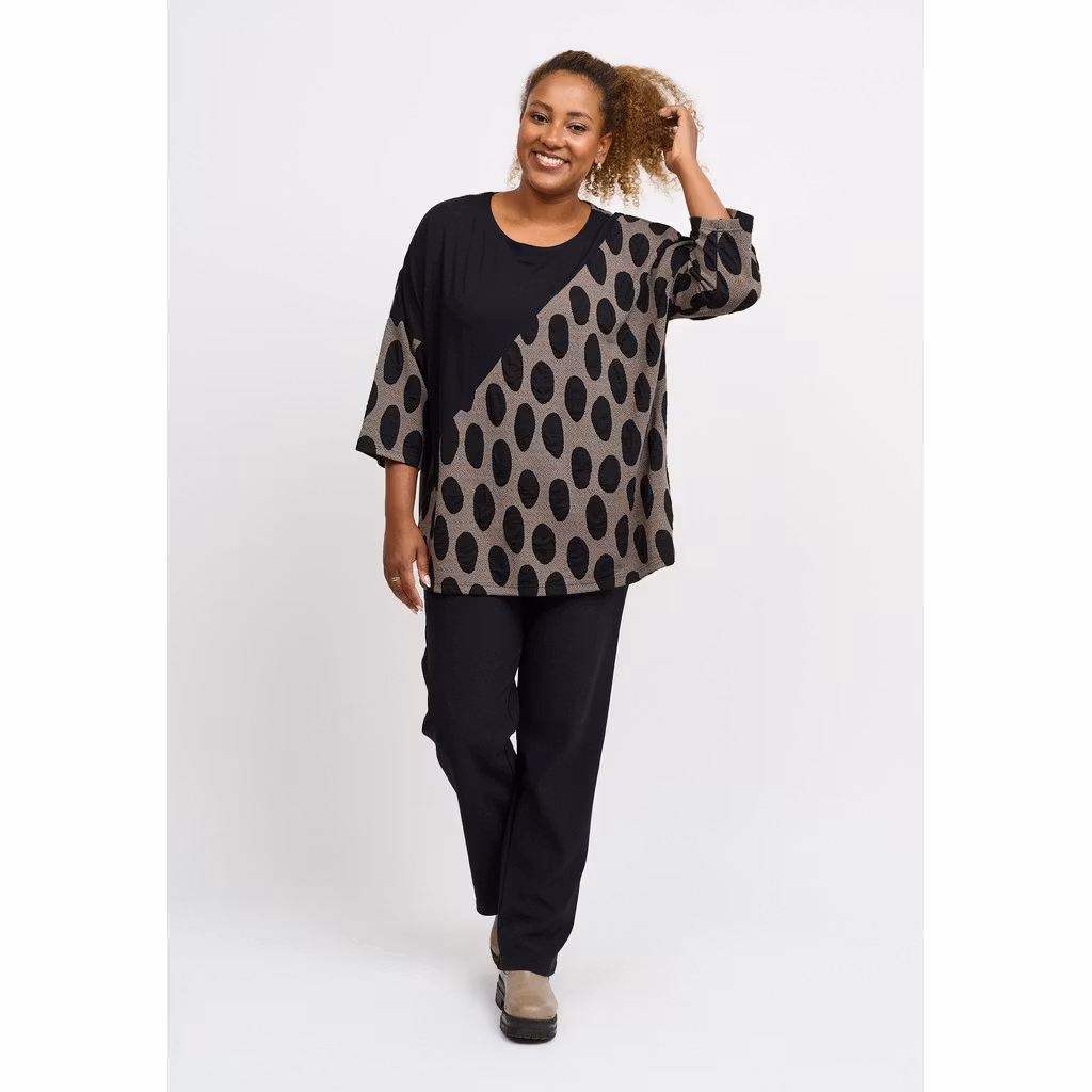 oversize tunika från pont neuf I lager. 1 199 kr storlekar s m XL 3XL Lägg i korgen Antal: Snygg tunika med lite nedhasade ärmar, fickor i sidan och rundad halsljusbrun bottenfärg, svarta ovala mönster. delat på tvären med ett svart tyg. Snygg! 96% viskos 4% elastantvättråd 30 grader